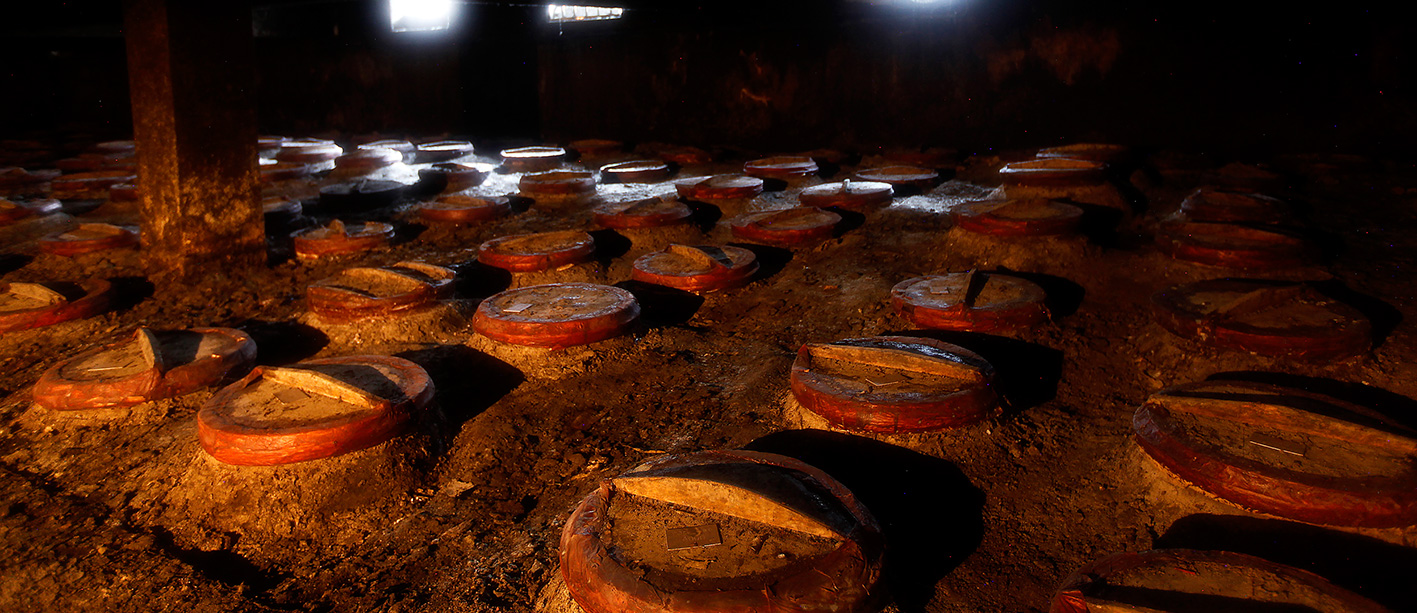 地下酒窖總占地面積3322平方米,總建筑面積5658平方米,窖內(nèi)共有陶壇3800余只,儲酒陶壇壇齡在百年以上,被譽(yù)為“中國白酒的地下宮殿”。儲存的原酒在獨(dú)特的培土窖藏環(huán)境中,歷經(jīng)歲月沉淀,酒體自然老熟,成為滴滴珍貴的稀世陳釀,被稱為“液體黃金”。